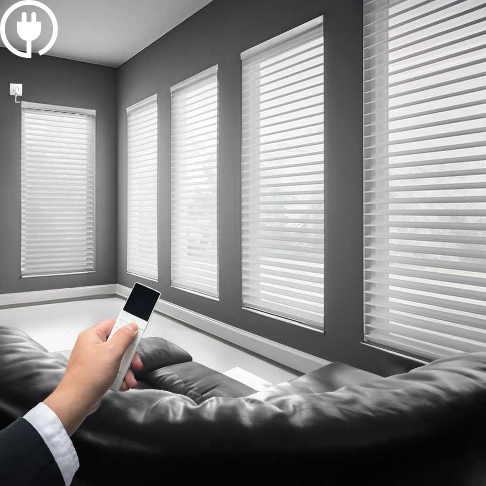 Elevate your home with hardwired motorized Shangri-La sheer shades, offering luxurious light control, privacy, and seamless smart home integration. These elegant dual-layer sheer fabric blinds softly diffuse light while providing privacy, creating a sophisticated and modern look for any space.