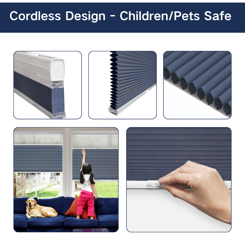 No-Drill Cordless Day-Night Cellular Shades offer effortless installation with a tool-free, renter-friendly design. Featuring dual-fabric light control, switch between sheer filtering for daylight and blackout for privacy. The honeycomb structure improves energy efficiency, while the cordless lift system ensures child and pet safety. Perfect for any room!