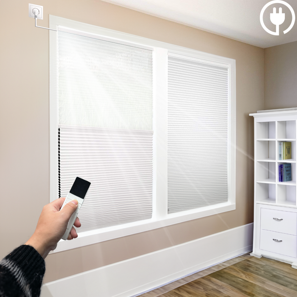 Enhance your home with motorized day-night cellular shades, designed for ultimate light control, energy efficiency, and modern convenience. These hardwired smart blinds feature a dual-layer honeycomb structure, allowing you to switch between light-filtering and blackout fabrics for day and night functionality.